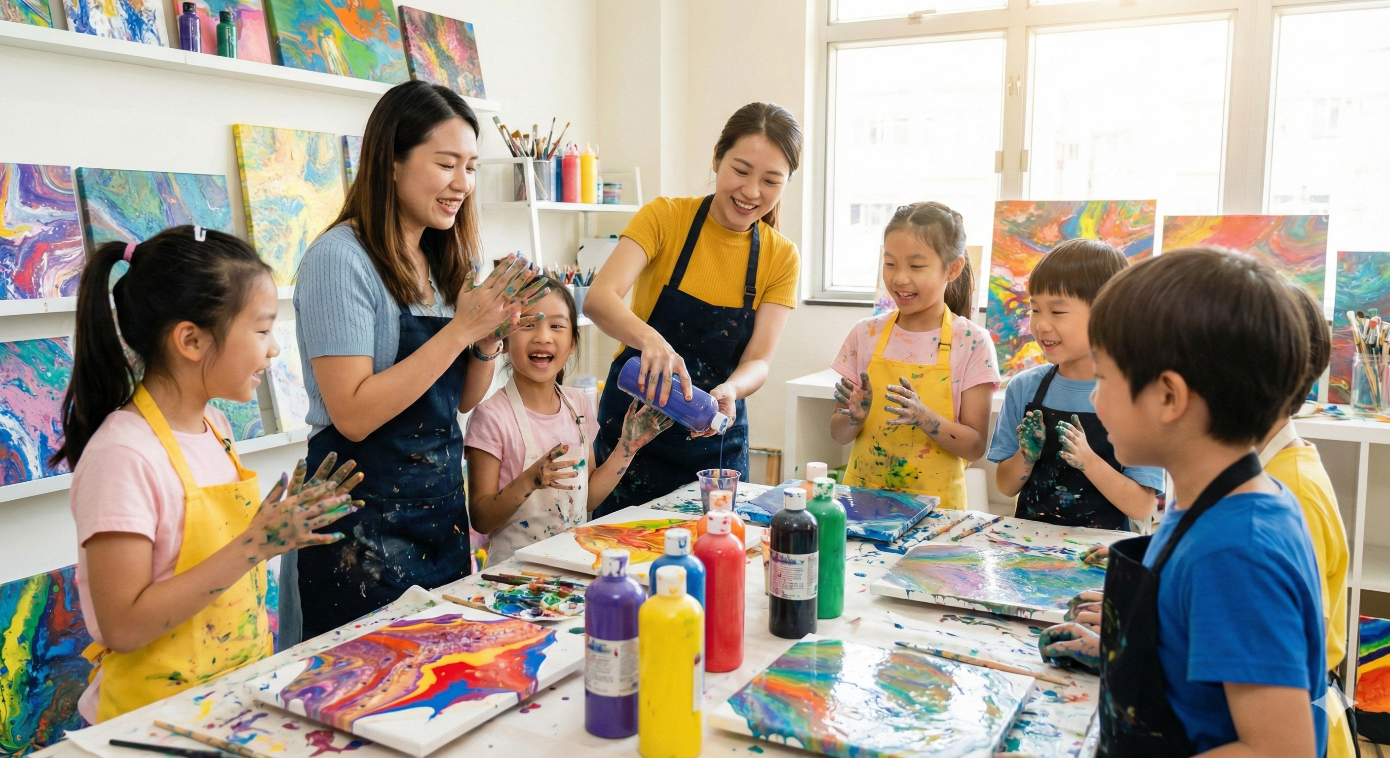 此年齡層建議以「體驗為主」,由家長或老師協助倒色,小朋友負責選色與觀察顏料流動。百獅流體熊材料包的一人一包設計,能避免孩子爭搶材料,也讓流程更安全。