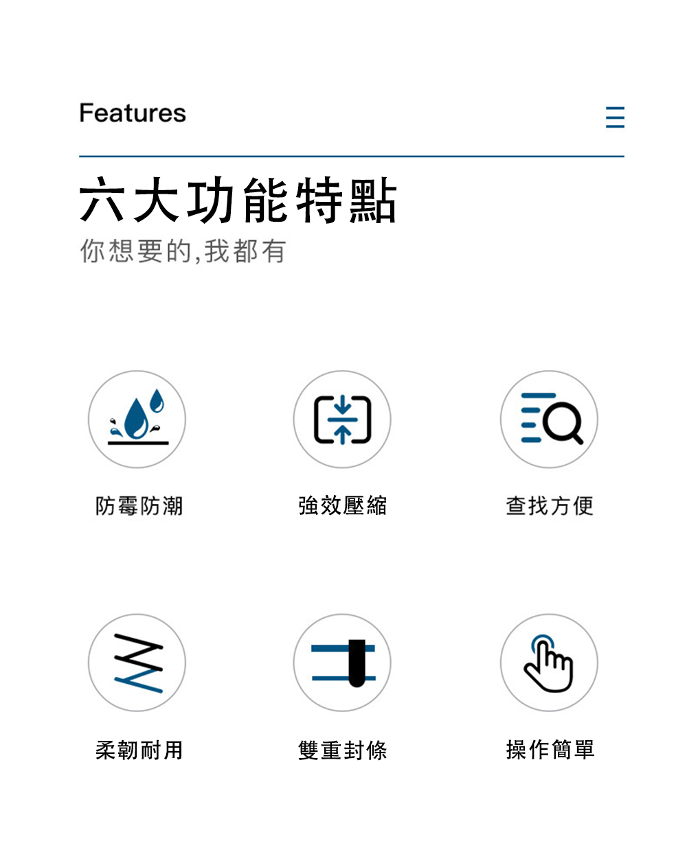 1.防霉防潮 2.強效壓縮 3.查找方便